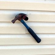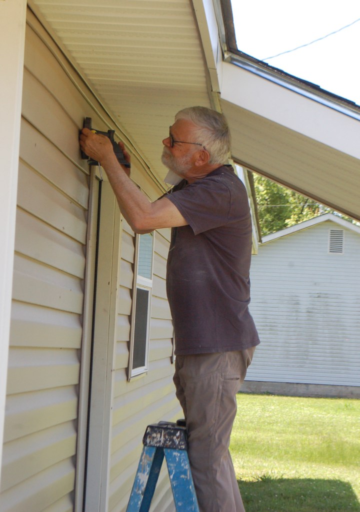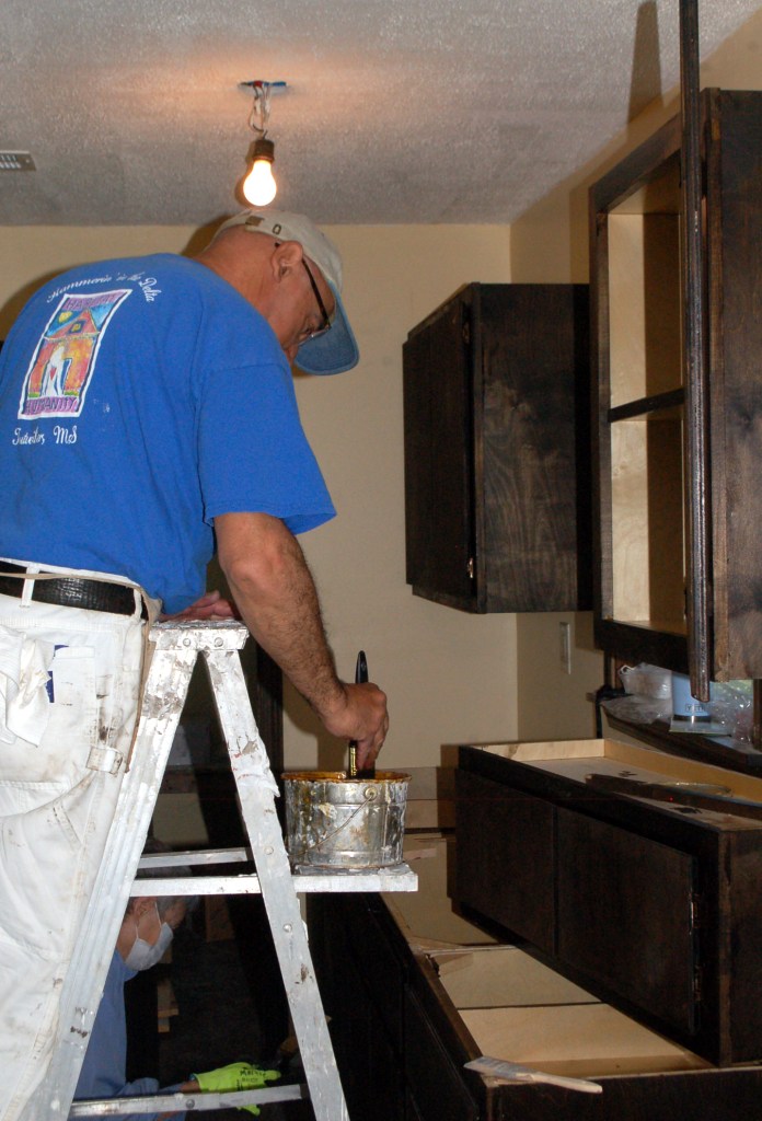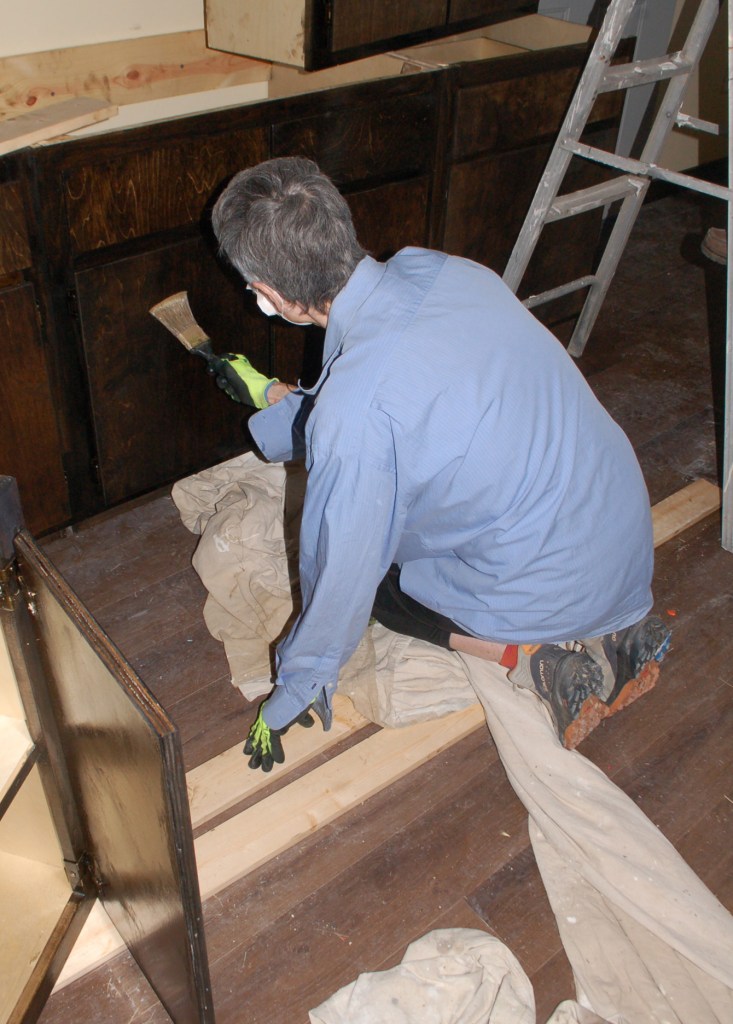Andy finishes a spot on the siding while Jon and Dino finish up the kitchen cabinets.