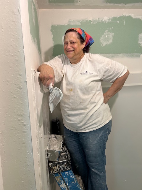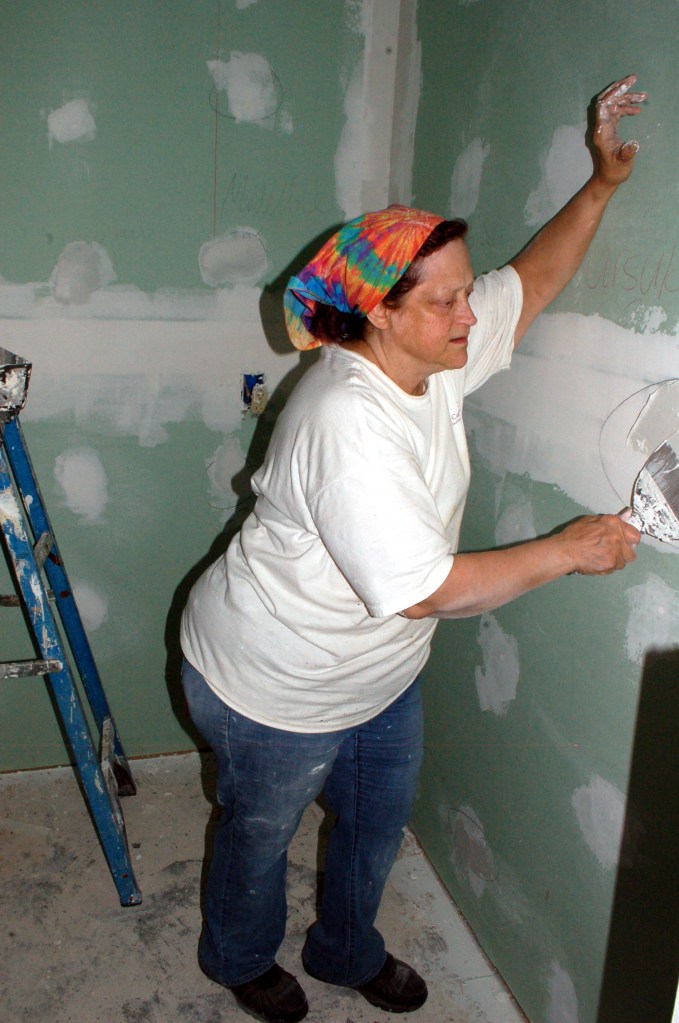 Meanwhile next door, the crew has gotten down to mudding. Charlotte is doing the bathroom.