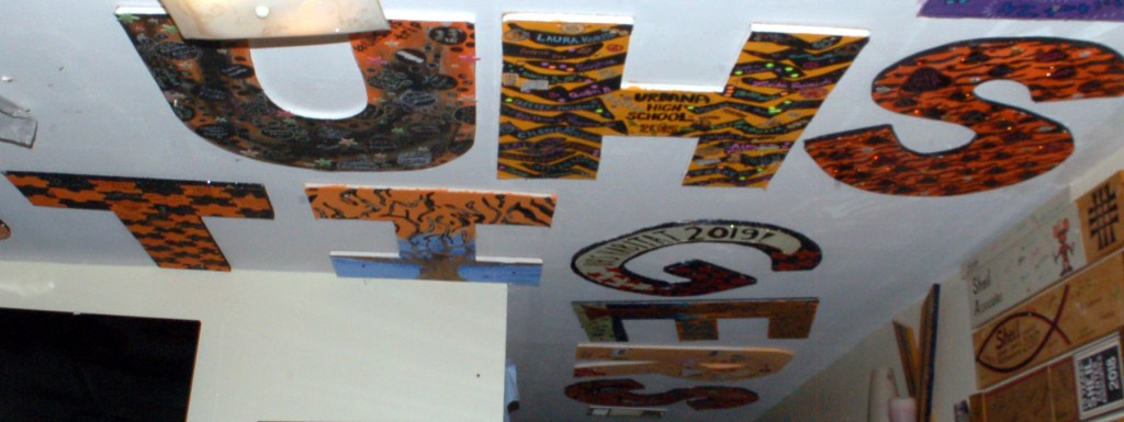 The dorm is covered with signs, t-shirts, and all sorts of assorted paraphernalia memorializing their visit. For groups who show up repeatedly, or annually as we do, they can start to take up a good amount of space. The largest one is probably about 3′ x 4′ and takes up a considerable amount of the ceiling. The group from Urbanna High School has also been showing up for years, and has added another two-foot letter to the ceiling every year.
