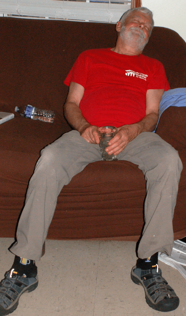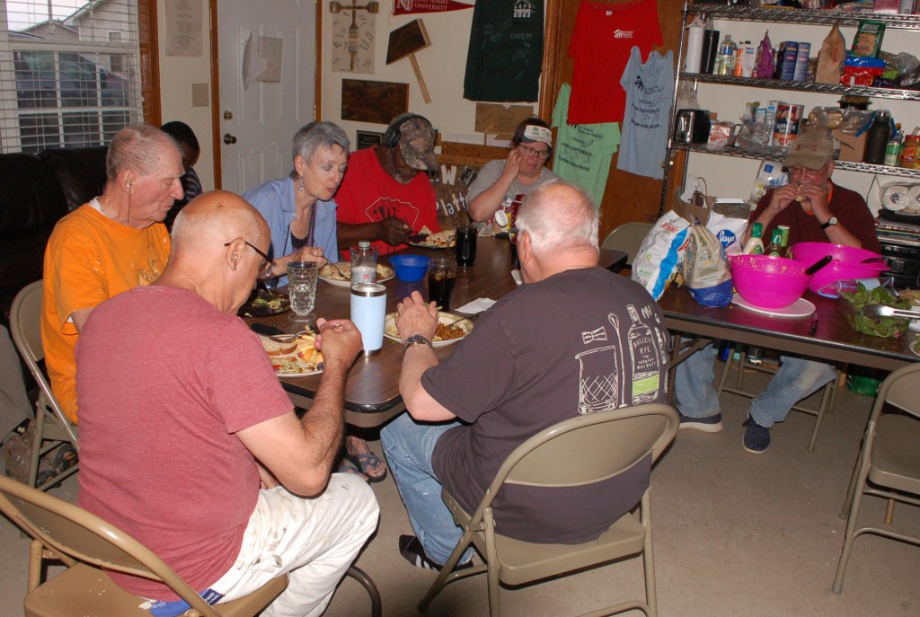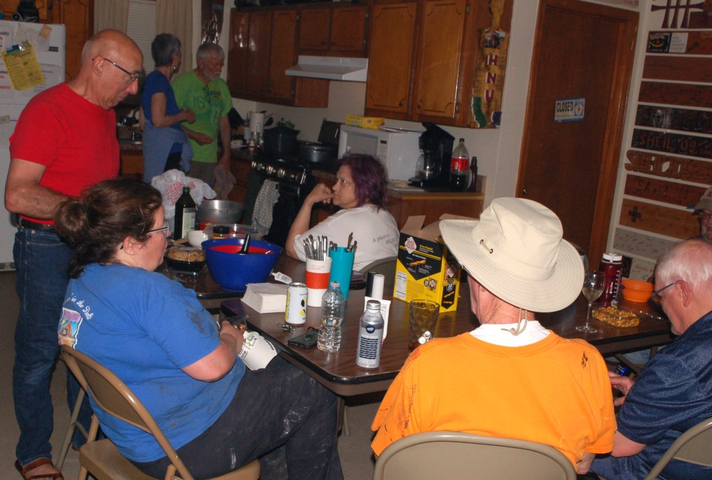 The end of the day usually consists of people coming in, sipping a beverage of their choice, and deciding when they want to get in line for the shower. There is not much point in showering in the morning and then going out and getting hot and sweaty and covered with saw dust, wood stain, and assorted building detritus.