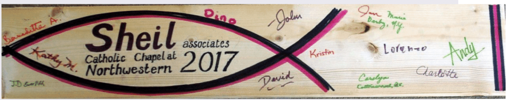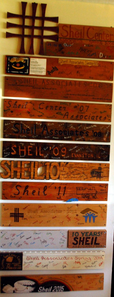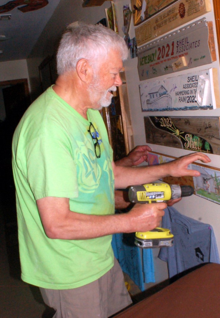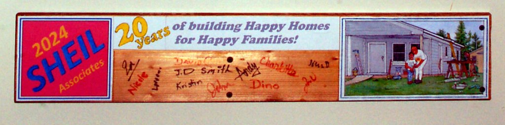 In recent years, (well actually not all that recent, as it is about the past ten or so,) the multitalented Andy Thomas has designed and made our signs. Often they reflect what kind of work we have done during the week, so we have signs made of vinyl siding, dry wall, lumber, floor tile, and whatever else we might have used, or they reflect events of the week, like the one with a picture of Noah’s ark to commemorate the year it rained all week and we slogged through mud all week.