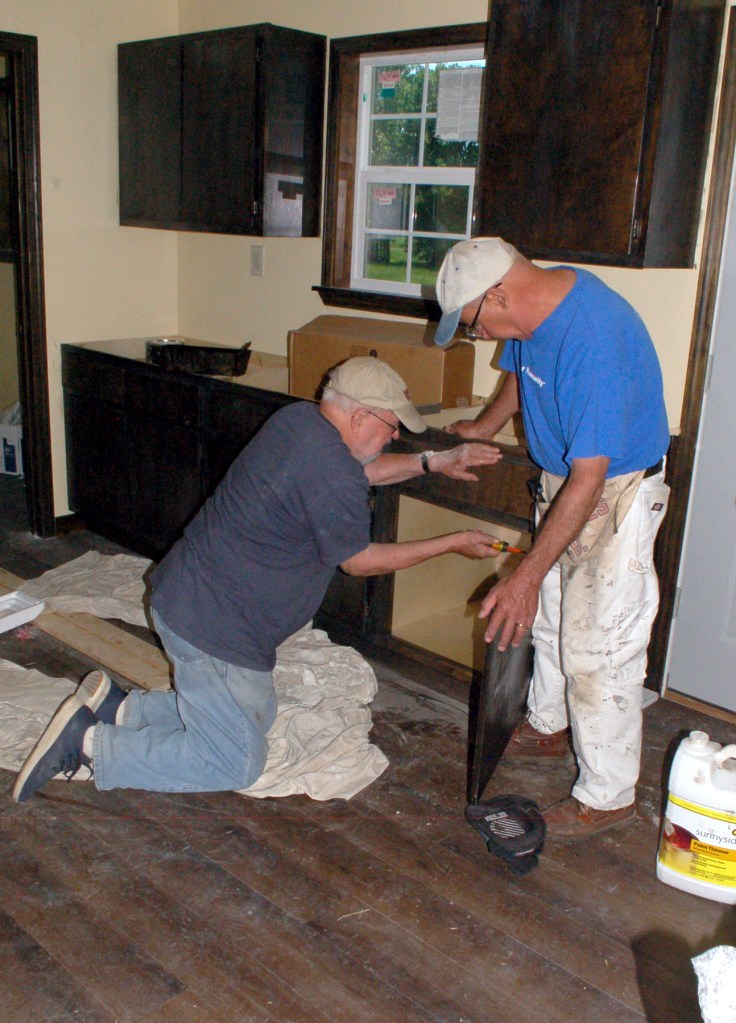 By this point, just about all the cabinets have been hung. Dino and Maryse are doing some touching up on the ones in the kitchen.