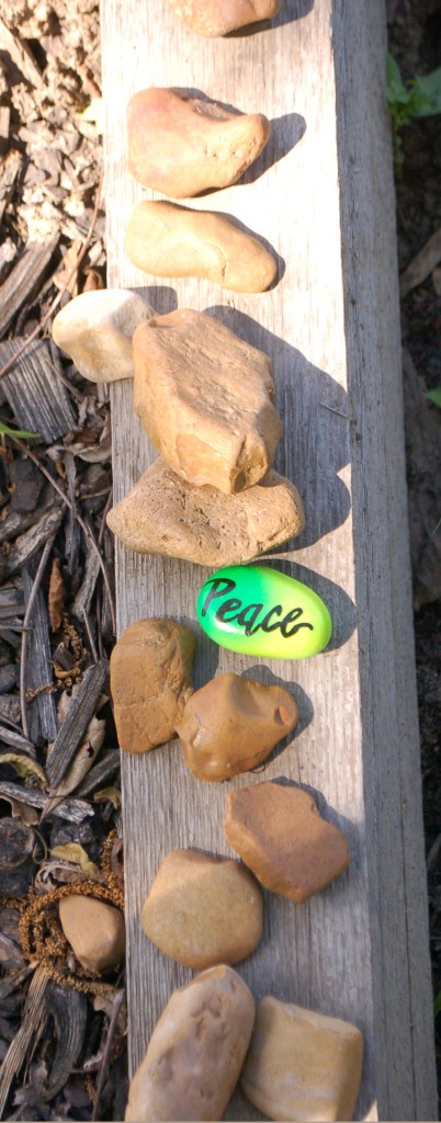 Rocks placed around the base of the sign. Most of them were taken from the adjacent macadamized road, though someone supplied a more personal message.