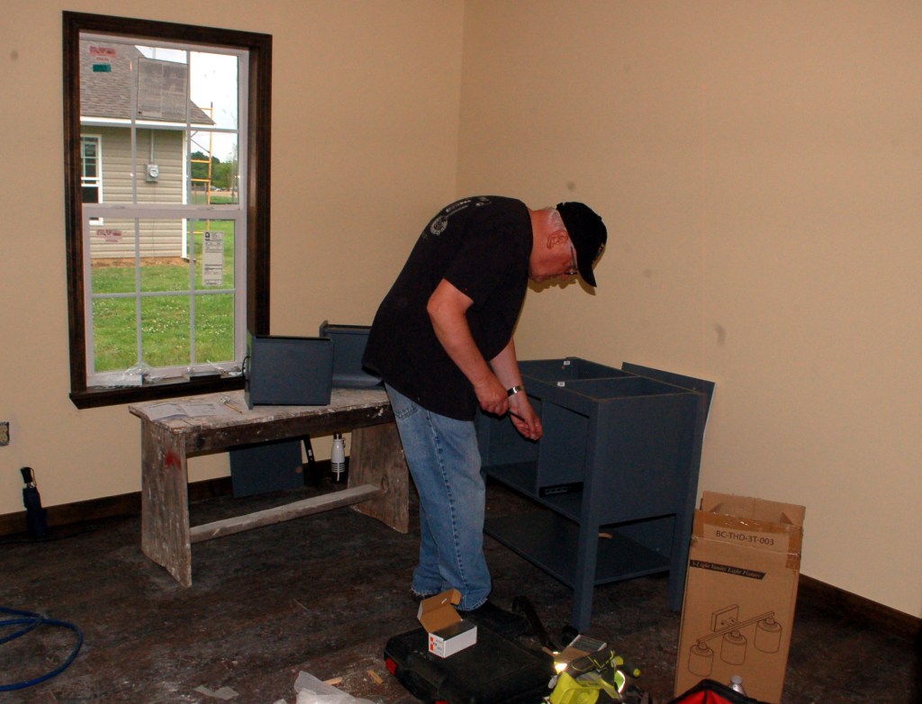 Ed and Mike cutting trimJim, Dino and Charlotte staining cabinetsAndy and Jon man the saw
