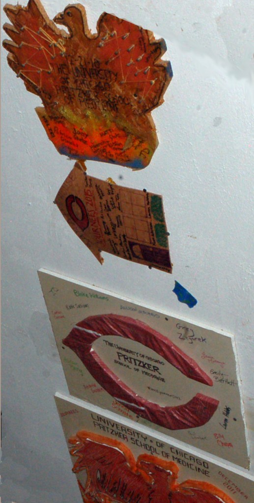 We long ago took over the wall adjacent to the bathroom and had to move to another wall. This required us to move a sign or two, specifically the ones from the University of Chicago Pritzker School of Medicine, but we were nice and reinstalled it on the ceiling around a number of their other signs.