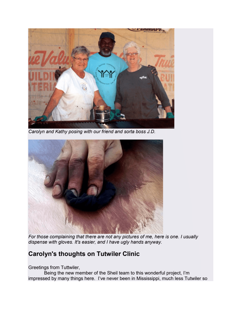 At the preparation meeting for my first trip, several people talked about how they would travel down to Tutwiler, work hard all year in often oppressive heat, sleeping in some rustic facilities, and come home feeling like they had been on vacation. We have contributed a lot over the years. We have been blessed with a lot as well. Carolyn made her contribution and clearly felt the blessings.