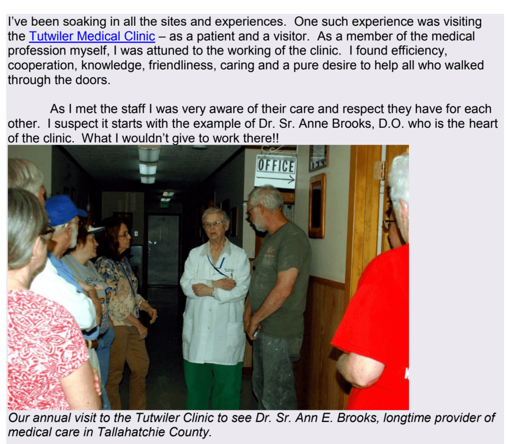 All the social progress down here began when Sr. Anne Brooks, SNJM graduated from medical school and needed a place to practice. Since the government had paid her tuition, she was obligated to spend several years in an underserved community. That is a challenge for a newly minted doctor, but less so for a nun. She wound up in Tutwiler, which just happened to have a (non-functioning) clinic. She used to say, “They didn’t tell me they had a clinic and I didn’t tell them I was a nun.”