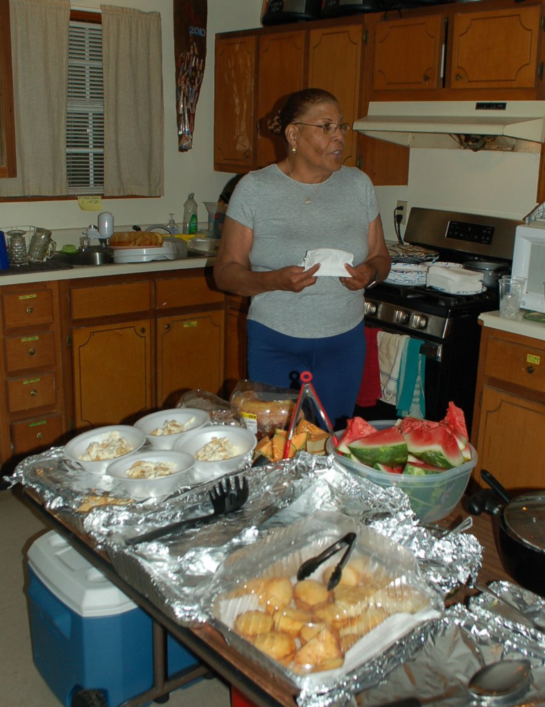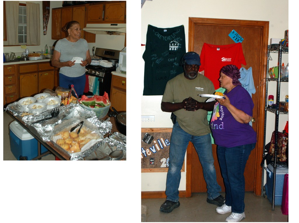 On Fridays, we gather for a potluck dinner with some of the homeowners and people on the WTHFH board. This year the community center was closed on Friday night, so we held it at the dorm instead. Program director Sherri provided a tent for us to dine outside.