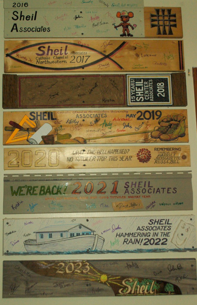The volunteer groups often put something on the wall comemorating their visit. This can range from t-shirts to exhibits that are far more elaborate. The first year I came down, the plaques for the Sheil team took up about half of one wall, in no particular order. When we come down on Saturday we have Sunday off and most of us go off to visit some cultural attraction or another. That year a few people stayed behind and organized all those plaques in chronicalogical order. Since then we filled that wall and started on another one. That required relocating a few of the existing momentos, but we were nice about it and tried to keep them with others from their group (like relocating one from the University of Chicago Pritzker School of Medicine to the ceiling.)