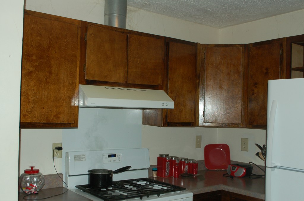 Meanwhile, the kitchen cabinets were terrible. I took them all down, sanded them down, and refinished them.