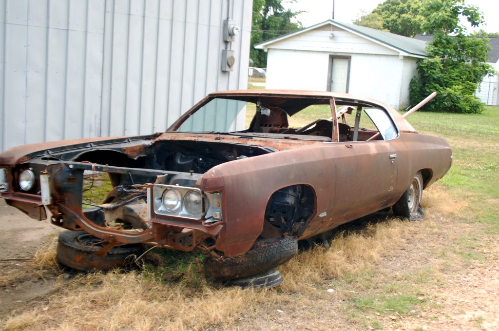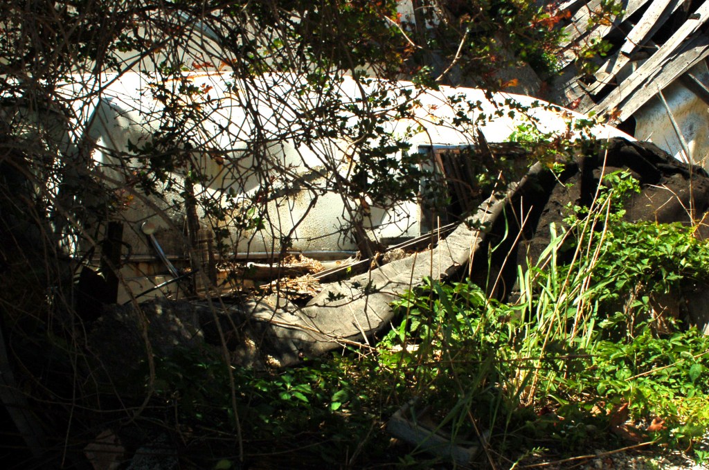 I am not sure when this place burned down, or how long this car has been sitting there. Perhaps it will eventually degrade into its consituent molecules and improve the iron content of the local soil.