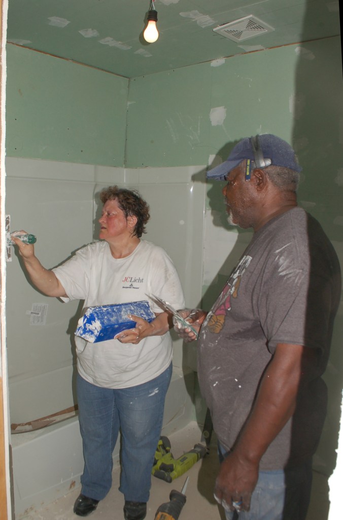 Here JD points out to Charlotte the spots that have to be mudded in the bathroom. We will be sanding those down tomorrow.