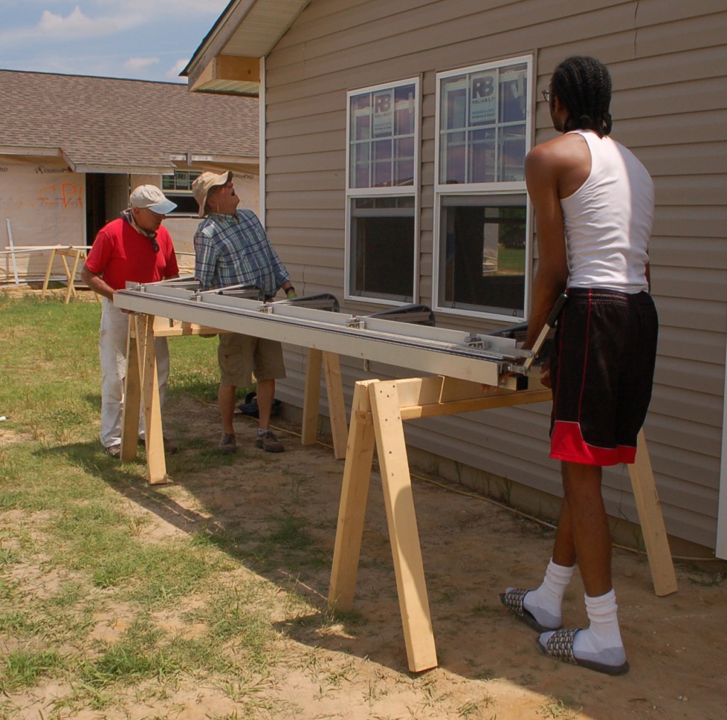 Next door, Dino and Dave are cutting siding and Kristin and Lorenzo are making sure it fits.