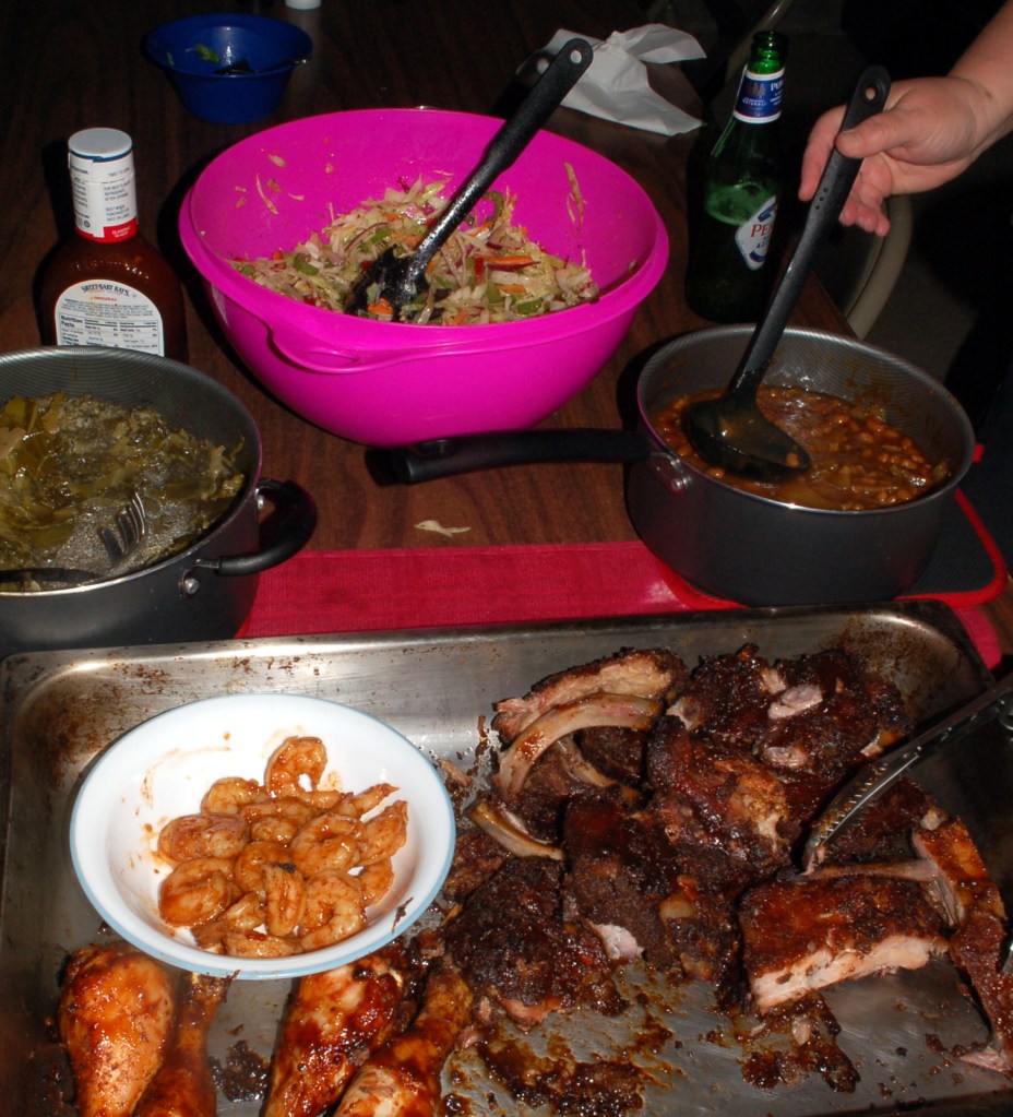 Despite the hard work often in considerable heat, this is not a place to lose weight. We eat really well down here. Andy is an accomplished chef, and several of the rest of the crew are not bad either. Andy usually fills up his smoker the week before we leave and brings down enough for at least a couple meals. Here is dinner Monday night consisting of smoked ribs, chicken, and shrimp, Southern greens, and cowboy beans.
