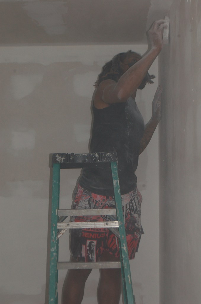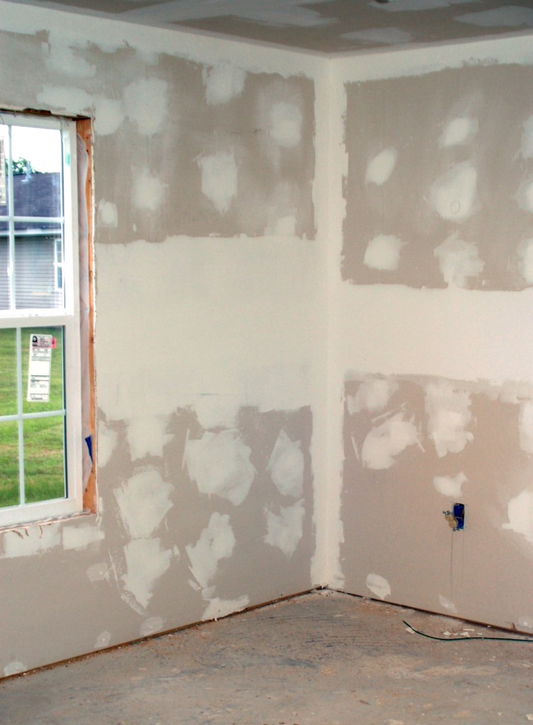 Meanwhile next door, we are working on sanding down the walls. First you mud the rough and uneven spots or the seams between pieces of drywall, then when the mud dries, you sand it down to create a smooth surface. Simple, right?