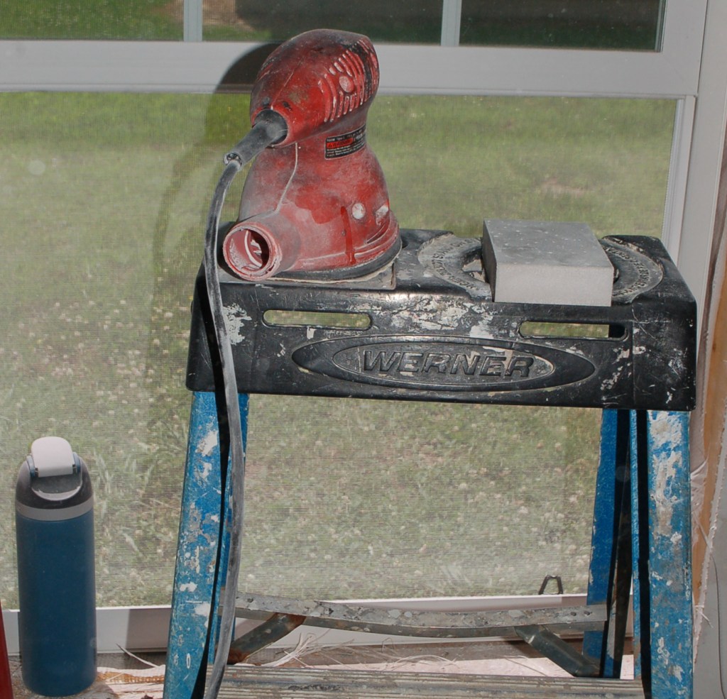 These are sanding tools. On the right is a sanding block which gets the job done and is useful for fine detail. On the left is a rotary sander. I started bringing these along the year after we had to redo somebody’s door and cabinets because of the poor job the group ahead of us had done. Doing it by hand can be tedious.
